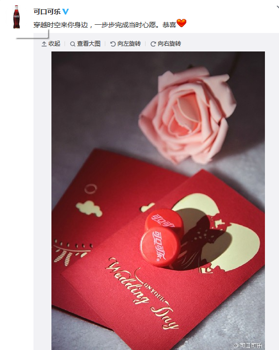 熱門事件的曝光平臺基本上基于微博微信兩者之間,其中也包括事件的預熱階段,如周杰倫結婚,從信息爆出到婚禮結束,均在微博話題榜單首頁。但微博平臺的短效熱議度決定了一個事件從發(fā)生到結束時間一般為1-2天,甚至短到可以按小時來計算。所以,在熱門事件或是話題人物出來后,品牌首先需要捷足先登的發(fā)出帶有品牌形象的關聯(lián)文案,讓粉絲第一時間知曉后轉發(fā)并互動,既有娛樂敏感性又能產生流量。以吳奇隆劉詩詩領證為例,代表作:可口可樂、杜蕾斯、飄柔、天貓等。