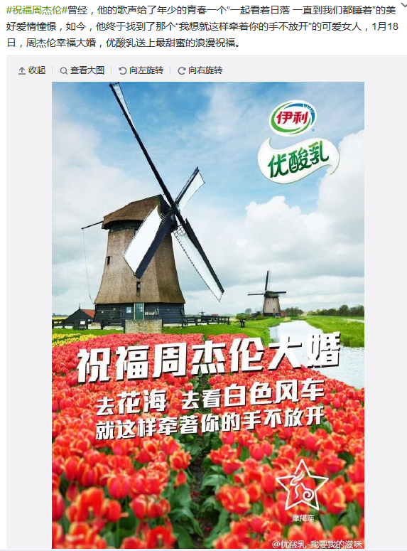 借勢營銷的范圍很大,這里我們只說熱點事件的借勢營銷,品牌最愿意看到的是代言人能在代言的時段里有所“作為”,就好比如果你認識王思聰,那你一定會拿他出來說些事兒一樣,當然這里面只包含積極向上的人物話題。這么看來,品牌借勢向熱點人物身上靠攏也是順理成章,在此基礎上獎品或是游戲互動則會讓傳播效果翻倍。比如周杰倫大婚時的美特斯邦威、伊利優(yōu)酸乳等。