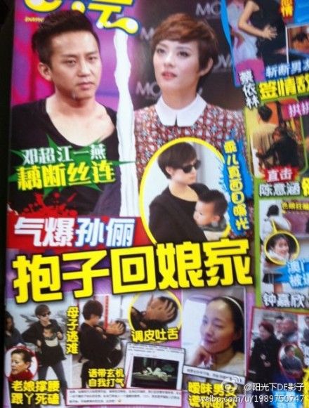 此前,周刊登載過(guò)一篇題為《直擊鄧超江一燕放縱寂寞夜》的文章,稱兩人在“幽靜別墅碰頭”深夜熱聊。日前,周刊又以重要版面刊發(fā)了一則題為《鄧超江一燕藕斷絲連 氣爆孫儷抱子回娘家》的文章,并配發(fā)了一組孫儷在母親的陪同下攜子現(xiàn)身機(jī)場(chǎng)的照片,引來(lái)不少網(wǎng)友的圍觀。照片中,孫儷一身黑衣素顏現(xiàn)身,黑超遮臉面無(wú)表情,還不時(shí)對(duì)著兒子等等說(shuō)著什么。周刊也對(duì)這組照片進(jìn)行了一番圖說(shuō)“老娘撐腰跟丫死磕”、“母子逃難”……